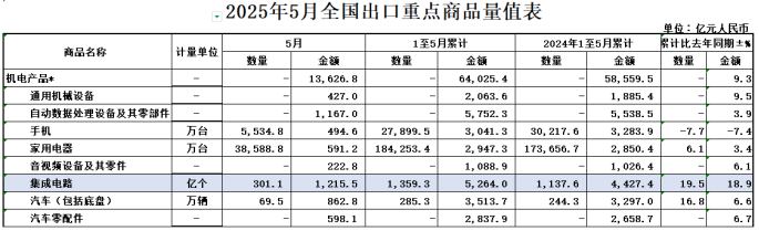 2025年1-5月,我国出口集成电路5264亿元,增长18.9%;进口集成电路11265.5亿元,增长7.3%