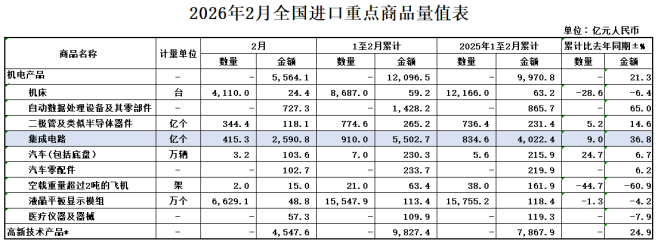 2026年前2个月,我国出口集成电路3046.7亿元,增长68.9%;进口集成电路5502.7亿元,增长36.8%